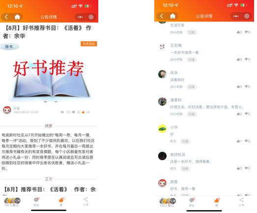 本次活動的開展既能方便大家在手機上通過“掌上云社區(qū)”參與閱讀與討論,還能夠引導(dǎo)帶動大家積極參與答題,寫出自己心中感受,讓閱讀成為一種習(xí)慣。社區(qū)居民們在評論中也表示,讀書是一輩子的事,多看書,看好書,才能開拓眼界,提升素質(zhì)。社會在發(fā)展,科學(xué)在不斷地創(chuàng)新,活到老學(xué)到老,才能跟上社會發(fā)展的步伐。