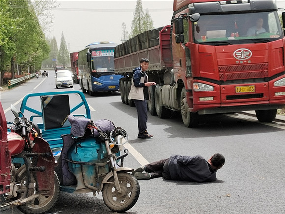 4月12日下午1點(diǎn)40分,江蘇省邳州市委政法委原副書記、現(xiàn)任邳州平安志愿者協(xié)會(huì)會(huì)長的李昂、邳州市文化研究會(huì)副會(huì)長孫宜方、原市多管局紀(jì)委書記,現(xiàn)任平安志愿者協(xié)會(huì)項(xiàng)目部部長王道理以及平安志愿者協(xié)會(huì)辦公室副主任王梓安,從土山調(diào)研平安志愿工作返回市區(qū),經(jīng)過邳睢省道土山大橋南30米處時(shí),突遇一輛機(jī)動(dòng)車三輪摩托車逆向行駛與一輛從南向北正常行駛的電動(dòng)車發(fā)生撞車事故。騎電動(dòng)車的議堂挑園村60歲的村民姜某和車子被撞倒在道路中央,身體受傷人不能動(dòng)彈。