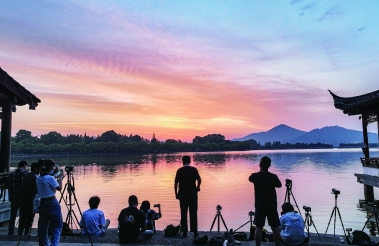 昨日凌晨五點,太陽從東方冉冉升起,天空再現(xiàn)絢麗的彩霞?;鸺t的朝霞倒映在玄武湖湖面,呈現(xiàn)了一幅湖天一色的美妙畫面。
