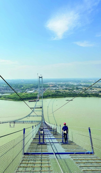 龍?zhí)堕L江大橋貓道將為主纜架設(shè)提供可靠的施工平臺。 南京日報/紫金山新聞記者 吳春霞 攝