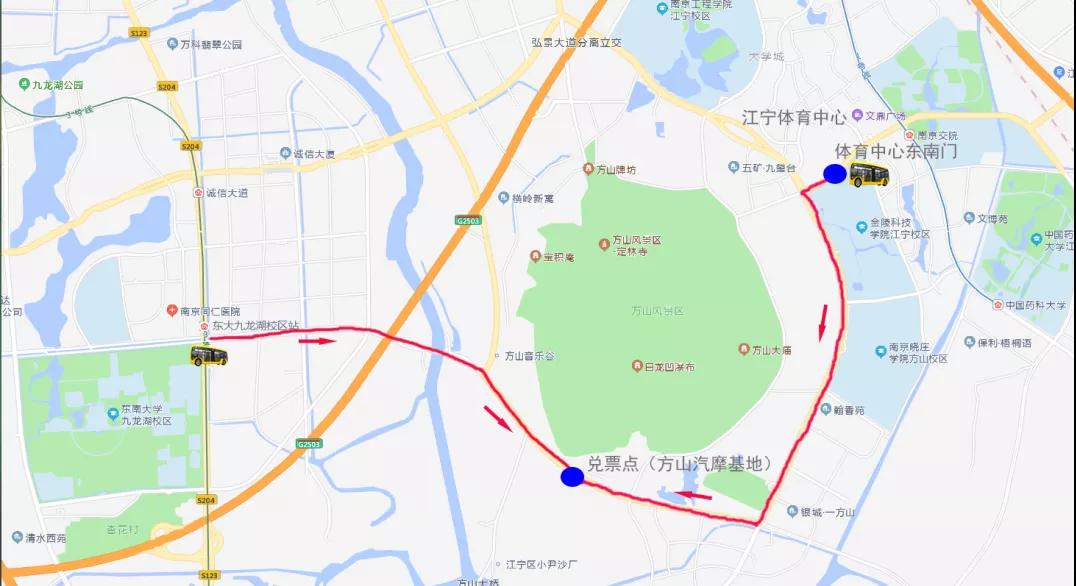 地鐵1號線南京交院站2號口出站,沿格致路步行800米前往江寧體育中心東南門乘坐官方免費接駁車抵達兌票點(方山汽摩基地)。