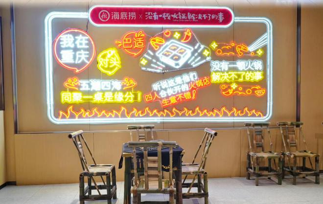 據(jù)了解,在電影《沒有一頓火鍋解決不了的事》中,劇情主要以重慶川味火鍋為場景展開,結(jié)尾提到主演四人開了一家火鍋店。海底撈借勢在重慶打造聯(lián)名主題店,霓虹燈墻、麻將桌等道具深度還原電影中的九餅戲園場景,成為絕佳的拍照打卡地。