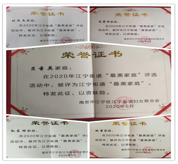 百善孝為先,她用柔弱的肩膀撐起整個家庭;新型冠狀肺炎來勢洶洶,她逆向而行,無私奉獻;一名黨員就是一面旗幟,他用實際行動支持并參與防疫戰(zhàn)斗,發(fā)揮黨員先鋒模范作用。在今年的最美家庭評選中,新銅社區(qū)5戶家庭分別榮獲2020年度江寧區(qū)江寧街道“孝老愛親”、“抗議先鋒”、“黨員示范”最美家庭榮譽稱號,其中2戶家庭獲得區(qū)級最美家庭榮譽稱號。