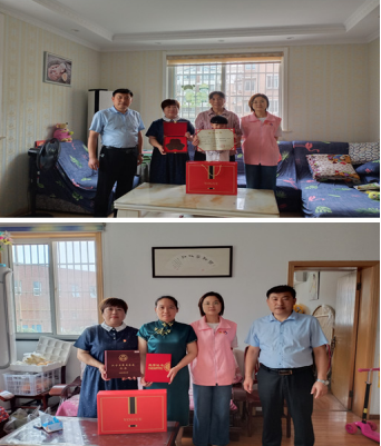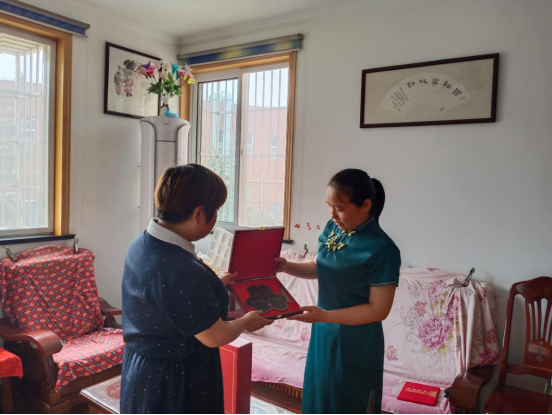 7月1日上午,新銅社區(qū)黨委副書記陳建康、婦聯(lián)主席魏秀香帶領工作人員、志愿者前往呂圣英、艾榮玨、孫東明、姚雪、劉成文家中,為他們頒發(fā)榮譽證書及獎牌,獻上祝福。