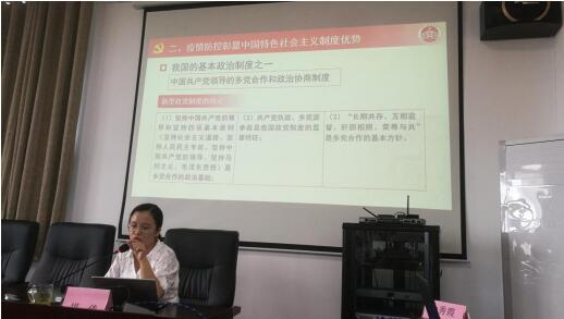隨后,邀請區(qū)委黨校胡倩老師開展了一堂主題為《疫情防控彰顯中國特色社會主義制度優(yōu)勢》的黨課,運用通俗易懂的語言、簡單明了的案例,帶領(lǐng)黨員感受戰(zhàn)“疫”的中國力量,深入了解疫情之下,中國共產(chǎn)黨領(lǐng)導(dǎo)和中國特色社會主義制度的優(yōu)勢。