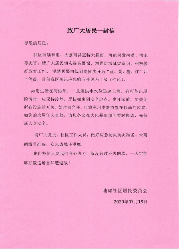 為全面貫徹落實習近平總書記對防汛救災工作的重要指示精神,防止6月15日災情再現(xiàn),近日,江寧區(qū)江寧街道陸郎社區(qū)緊急發(fā)放《致廣大居民一封信》,對沿河居民和地勢低洼居民進行重點告知和提醒,確保居民人身和財產(chǎn)安全。