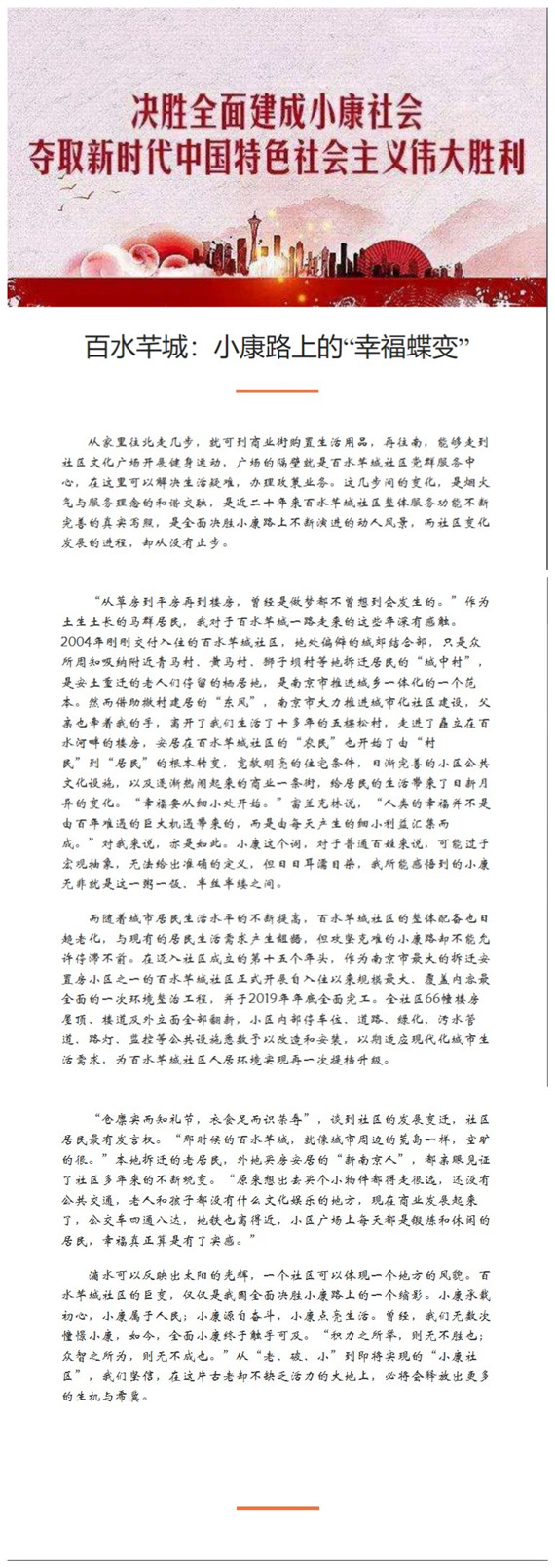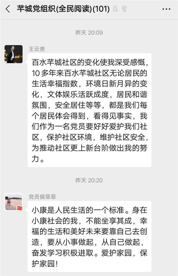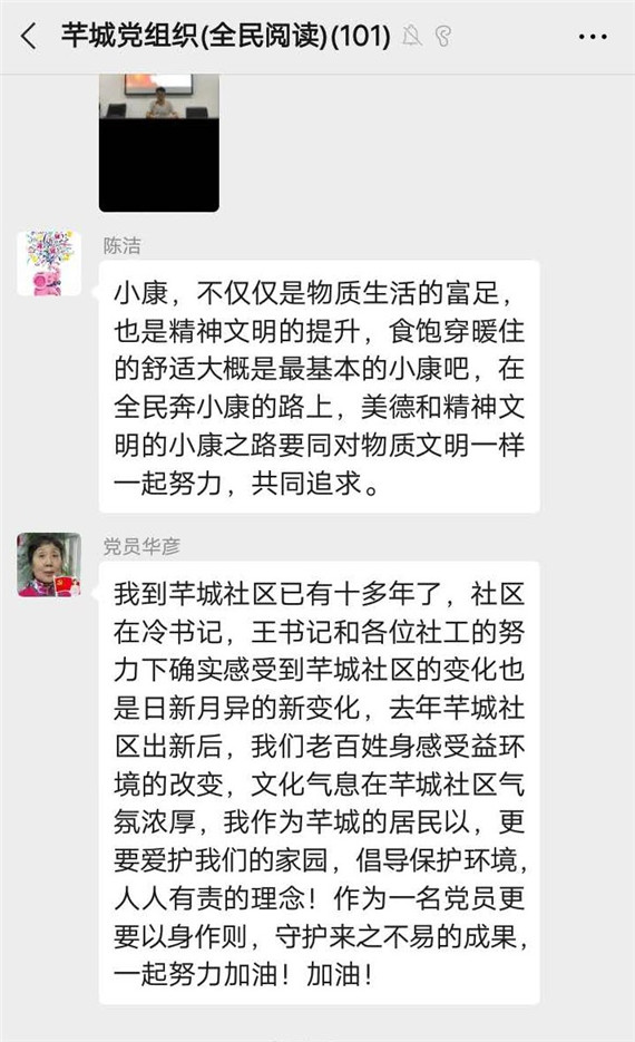 文章內(nèi)容講述了百水芊城居民自拆遷入住后向小康之路邁進的一系列動人故事,回溯歷史變遷、闡述發(fā)展新貌,短短二十年間,從草房、平房到樓房,從步行到汽車代步、便捷的公共交通,從單一種類到豐富多樣的食物內(nèi)容,從“老、破、小”的城中村到紫東建設(shè)高地,對于馬群人來說,小康的意義正內(nèi)化于這一粥一飯、半絲半縷之間,滲透到我們生活的方方面面。閱讀完故事內(nèi)容后,社區(qū)居民也深有感觸,紛紛講述自己眼中的小康生活和對即將全面建成小康社會的美好展望,青年人也更是深刻地認識到全面建成小康社會所應肩負的重任。