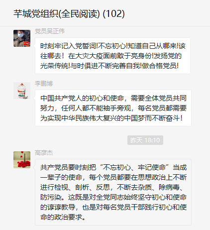 開展“不忘初心、牢記使命”主題教育,是對全黨理想信念的再教育、使命意識的再強(qiáng)化、奮斗精神的再激發(fā),也是開啟新征程的思想發(fā)動(dòng)、意志錘煉。百水芊城社區(qū)黨員在學(xué)習(xí)后紛紛分享學(xué)習(xí)感悟,決心以更高的標(biāo)準(zhǔn)要求自己,在實(shí)際工作中為民初心。(馬賢琳)