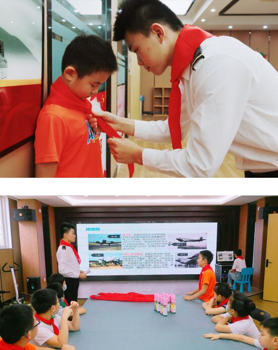 現(xiàn)場,志愿者通過播放視頻和現(xiàn)場講解,讓孩子們了解了“紅領巾”所代表著的深刻內(nèi)涵,感悟愛國主義精神,樹立投身祖國國防事業(yè)的理想。同時,來自南京航空航天大學飛行技術專業(yè)的飛行學員林童身穿飛行制服,為社區(qū)的孩子們佩戴上了紅領巾,并細致地講解正確的紅領巾佩戴過程。隨后,飛行員向孩子們講述了國防科技與我國航空航天事業(yè)的發(fā)展史,講述一代代中國航空、航天人的科研事跡,孩子們紛紛用畫筆在紙上畫出了屬于自己的“小飛機”,并一筆一劃地簽上了自己的名字。并表示長大了想當科學家,制造出更厲害的飛機!