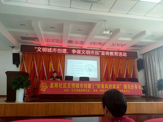 為深入貫徹落實(shí)習(xí)近平總書(shū)記“注重家庭、注重家教、注重家風(fēng)”的重要指示精神,教育引導(dǎo)廣大居民把家風(fēng)建設(shè)擺在重要位置,做到廉潔修身、廉潔齊家,8月15日,江寧區(qū)江寧街道星輝社區(qū)舉辦了“好家風(fēng)好家訓(xùn)”暨“文明城市創(chuàng)建,爭(zhēng)做文明市民”模范分享會(huì)活動(dòng)。