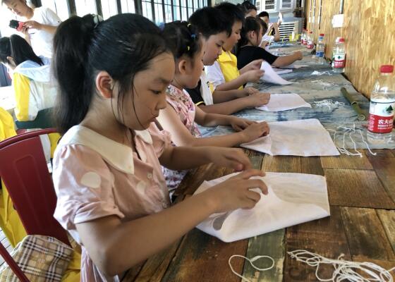 頂著火辣的太陽,沿著蜿蜒的小路,孩子們走進(jìn)竹林,親手制作了一只“竹子水槍”,體驗勞作的不易;又使用了天然染料和化學(xué)顏料分別制作了扎染作品,了解傳統(tǒng)技藝和現(xiàn)代藝術(shù)的區(qū)別;活動結(jié)尾,更是暢快淋漓的在群山環(huán)繞的廣闊草地自由奔跑,打上一場水仗,歡聲笑語不覺于耳。