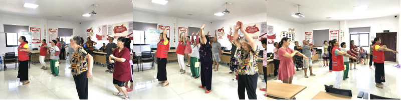 講座結束后,社工帶領村民們一起學跳養(yǎng)生健身操,從熱身到演示,從慢動作分解到跟著音樂節(jié)奏擺動,短短幾分鐘,現(xiàn)場氣氛歡快。養(yǎng)生健康操簡單易學,不僅能鍛煉身體、提高體質素養(yǎng)預防常見小疾病,還可以增添生活樂趣。