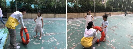 隨后,陳老師又給大家?guī)砹艘患蠖Y--“救生圈”,小朋友紛紛伸出手感受它表面的紋理以及它的重量。陳老師告訴小朋友們,救生圈雖然是一個有利的工具,但是在遇到他人呼救時不能率性而為,要充分考慮自己的能力,及時需求大人幫助。