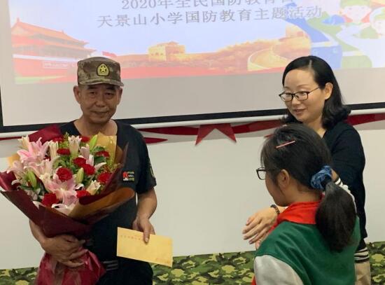 活動伊始,少先隊員向退伍老兵們獻上獻花并為他們佩戴紅領(lǐng)巾,以此表達對于退伍老兵們深深的敬佩之情。隨后,蔣科主任簡單介紹天景山小學(xué)的國防教育特色及近年來在開展國防教育方面取得的成果。退伍老兵是黨和國家的寶貴財富,為國家的國防建設(shè)做出了不可磨滅的貢獻,現(xiàn)場,郗靜校長為退伍老兵送上慰問金,感謝他們在青年時期懷著對黨、對祖國、對人民的無限忠誠,拋頭顱灑熱血站在戰(zhàn)爭的最前沿保衛(wèi)著我們的家鄉(xiāng)。