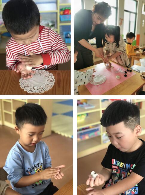 首先老師借助閱讀區(qū),為孩子們帶來關(guān)于中秋節(jié)的故事和兒歌。讓小朋友們了解到了中秋節(jié)的來歷,感受到中國傳統(tǒng)習(xí)俗的味道;接下來孩子嘗試制作月餅:從制作餡料的調(diào)制到月餅皮的制作,從包月餅餡再到用模具做出月餅,孩子們開心快樂的搟、壓、團,制作出一個個美味月餅。