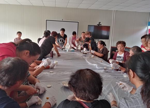 為表現(xiàn)闔家團(tuán)圓、喜慶豐收和對(duì)美好生活向往的主題,講座結(jié)束后,迎來(lái)今年中秋的特別活動(dòng)——DIY冰皮月餅的制作。社區(qū)工作人員將準(zhǔn)備好做月餅的原料、豆沙、黑芝麻餡料、手套、模具等材料一一擺放好。在工作人員的指導(dǎo)下,現(xiàn)場(chǎng)示范制作制作手工冰皮月餅的技巧,為大家詳細(xì)講解了月餅的制作過(guò)程后,便開始親自動(dòng)手。按照步驟:揉面團(tuán)、包餡、放模具內(nèi)按壓成型。大家第一次看到做月餅,心情激動(dòng),都迫不及待想要體驗(yàn)一番。大家圍成一桌,學(xué)著面點(diǎn)老師教的方法和步驟一起開始做月餅。在場(chǎng)的居民在制做的過(guò)程中都很細(xì)致和認(rèn)真,生怕一不小心用力過(guò)猛,捏壞了,大家看到自己第一次制作的冰皮月餅,從自己手中成型,都異常興奮和滿足。做完后很多居民迫不及待的就開始吃了起來(lái)。從做月餅到吃月餅的一套流程讓居民朋友們以另外一種方式體驗(yàn)了中國(guó)傳統(tǒng)佳節(jié)的魅力和美好。
