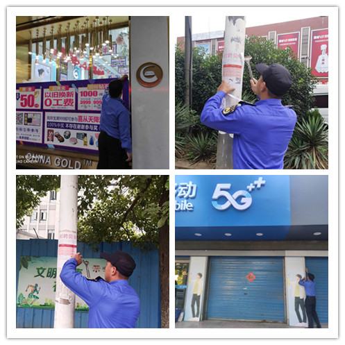 二、清理“亂貼亂畫”,保障環(huán)境秩序。電線桿、墻體、地面等區(qū)域小廣告、“牛皮癬”亂貼亂畫現(xiàn)象極易反復,且大多存在于主次干道、背街小巷、農(nóng)貿(mào)市場等重點區(qū)域路段,涉及面較廣,流動性較大。針對此情況,大隊組織專人開展巡查,明確問題易發(fā)點,一方面利用鏟刀、刷子等工具協(xié)同清理,發(fā)現(xiàn)一處,整治一處,確保“全面覆蓋、不留死角”;另一方面加強與沿街商戶及周邊居民群眾的溝通交流,從源頭抓好教育引導工作,加大“回頭看”的力度,確保“常態(tài)長效、不再反彈”。