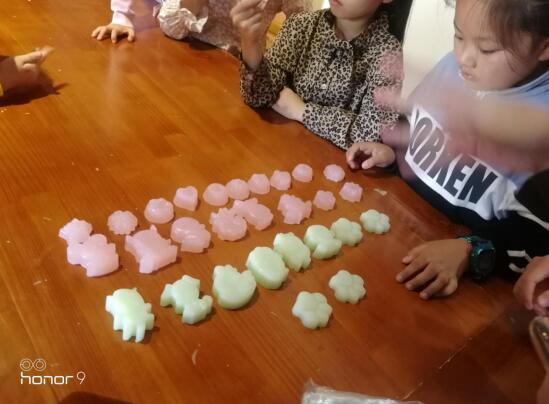 社區(qū)計(jì)生志愿者、婦聯(lián)志愿者和皓月社工帶領(lǐng)小朋友們把皂基和牛奶倒進(jìn)容器再放進(jìn)微波爐加熱融化,融化皂基期間,社工給每位小朋友的手上滴上精油,孩子們跟著社工搓起小手,不一會兒香味飄散出來,小朋友們驚嘆道“好香啊!是橙子味!”社工把精油加入皂基中進(jìn)行攪拌,小朋友們開始挑選出自己喜歡的模具,將液化的皂基注入自己喜歡的模具中,并放入冰箱冷固,一套自己親手制作的精油香皂就已經(jīng)完成一大半啦!