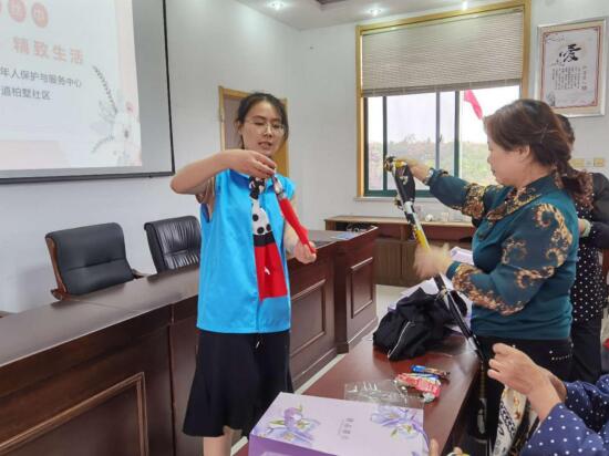 演示操作環(huán)節(jié),活動(dòng)現(xiàn)場(chǎng)氣氛活躍,個(gè)個(gè)熱情高漲。居民們跟隨著老師的步驟,讓一條絲巾成了百變絲巾:在娛樂場(chǎng)合,將絲巾在胸前打上個(gè)花結(jié),顯示端莊淑美;在正式場(chǎng)合,將大絲巾披在肩上,展示華麗與優(yōu)雅;在休閑場(chǎng)合,將花絲巾系在頸后,便多了幾分飄逸的動(dòng)感。
