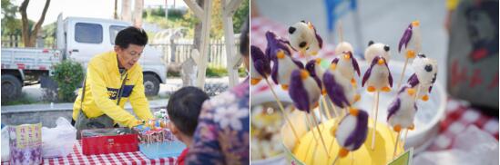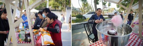“好吃又好看的點心,過來嘗一嘗,看一看啊……”循聲望去,南京粽子叔叔的攤位前已經(jīng)擠滿了一個個眨巴著眼睛的孩子,這邊孩子們還沒掏出錢,“棉花糖,棉花糖,新鮮出爐的棉花糖……”又被旁邊的棉花糖吸引過去,在一聲聲此起彼伏的叫賣聲中,彭福村的鄰里集市正式拉開了帷幕。