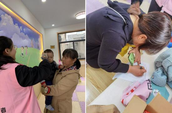 活動現(xiàn)場,社區(qū)工作人員與巾幗志愿者早早來到親子活動中心,為參加活動的家長和孩子們測量體溫以及簽到登記。