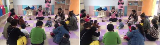 隨著活動的正式開始,育嬰老師以一首七步舞暖場,孩子和家長手拿沙錘和沙蛋一起跟著音樂跳舞,家長與孩子們一起互動,感受音樂的節(jié)奏。接著,鍛煉孩子們的交際能力,老師以手傳球的方式帶領(lǐng)小朋友們開始自我介紹。