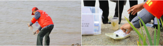 長江南京段是野生江豚的棲息地,而水質(zhì)、水環(huán)境是否“健康”,對于水生物的生存有著至關(guān)重要的影響。檢測水質(zhì)是觀察長江水源有沒有被污染的重要手段之一?;顒赢?dāng)天,新洲村9名志愿者們來到活動現(xiàn)場,張隊(duì)長來到江邊進(jìn)行取水,對江水的溶解氧和總磷進(jìn)行了簡單的測試,并進(jìn)行了比色,檢測水質(zhì)較好,此次對江水共進(jìn)行了4項(xiàng)檢測,包含溶解氧、總磷、氨氮和PH值。