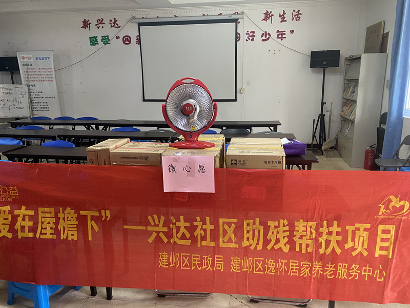 楊某與母親均為興達(dá)社區(qū)智力殘障居民,母親還伴有中風(fēng),常年臥病在床,家里只有父親是唯一的正常人士,在照顧母子倆生活的間隙靠打零工維持家用,家庭條件及其艱苦。隨著冬季的到來,氣溫逐漸下降,在寒冷的冬季能夠有一個(gè)取暖器給癱瘓?jiān)诖驳钠拮尤∨彩呛苌莩薜氖虑椤?2月5日,興達(dá)社區(qū)聯(lián)合“愛在屋檐下”項(xiàng)目組為楊磊這樣的困難殘疾人家庭送來了小太陽取暖器,用愛心、細(xì)心、關(guān)心接力讓冬季不再寒冷。