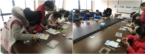 活動伊始,志愿者向在場的小朋友們簡單介紹了今天的活動內(nèi)容和注意事項,普及臺燈的工作原理和制作方法,教導孩子們學會看制作圖,并給孩子們分發(fā)了包括有電池盒、開關(guān)按鈕、2p線、紙杯燈罩、木塊架、LED燈、雙面膠、乳膠以及綁帶等工具的材料包。在制作過程中,志愿者一邊指導,一邊普及一些電路小常識。小朋友們一邊連接電路,裝上燈泡和開關(guān),罩上燈罩,一邊詢問志愿者操作步驟的準確性,在得到志愿者的肯定后,不一會,小小的電燈泡一下亮了起來。