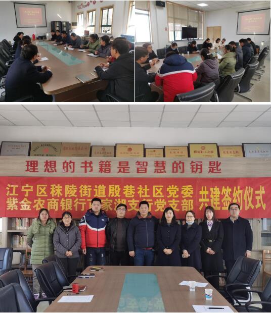 為加強(qiáng)村銀聯(lián)動(dòng),加強(qiáng)黨建學(xué)習(xí),構(gòu)建長(zhǎng)期互助機(jī)制,實(shí)施鄉(xiāng)村振興戰(zhàn)略、率先基本實(shí)現(xiàn)農(nóng)業(yè)農(nóng)村現(xiàn)代化奠定堅(jiān)實(shí)基礎(chǔ),12月17日上午,江寧區(qū)秣陵街道殷巷社區(qū)黨委與紫金農(nóng)商銀行百家湖支行黨支部達(dá)成共建意向,舉辦簽約活動(dòng),并舉行了第一次主題黨日活動(dòng)。