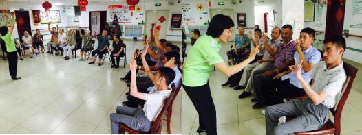 《音樂照顧》是指在專業(yè)人士帶動下,根據(jù)不同對象而設(shè)計的音樂節(jié)拍,配合參與者身體動作的變化,達到活化身心,心情愉悅的效果?;顒右潦迹魳氛疹檸煄ьI(lǐng)殘疾朋友們做手指操,在座的參與者們認真參與,在鍛煉手指靈活度的同時激發(fā)大腦的活力。簡單有趣的手指操做完后,音樂照顧師又帶領(lǐng)殘疾朋友們在節(jié)奏輕快的伴奏中拍打全身經(jīng)絡(luò)活化身體。在10曲目的優(yōu)美旋律中,殘疾朋友們感受到內(nèi)心的安詳和歡樂,尤其是有跳躍動作時,殘友們在跳躍的瞬間釋放出來自心底的壓力,感受心靈深處的快樂。