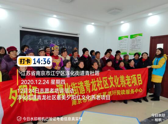 為培養(yǎng)社區(qū)老年人參與文化活動(dòng)的熱情和能力,提升社區(qū)老年人的文化素質(zhì),豐富社區(qū)老年人的業(yè)余文化生活,12月24日下午,在江寧區(qū)淳化街道青龍社區(qū)大力支持下,茗書軒閱讀服務(wù)中心在青龍社區(qū)開展文化養(yǎng)老志愿者培訓(xùn)服務(wù)活動(dòng)。