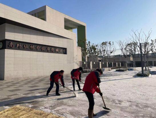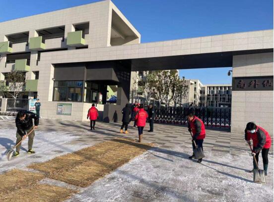 一大早,攝山村新時代文明實踐站的工作人員早早來到華僑城小學校大門處,室外的溫度在零度以下,雖然寒風刺骨,但沒有阻擋大家的掃雪熱情,積極投入到掃雪工作中。村工作人員們躬著身子,你一鍬、我一鏟,用鐵鍬鏟除凝結的冰凍,用掃帚掃走路面的積雪。雪下得雖然不厚但上凍容易打滑,便在校園門口鋪上草墊,以防意外。村全體工作人員克服困難,凝心聚力,投入了百分百的熱情,將校園主門處及校園周邊道路積雪清掃干凈,確保了進出學校周邊道路的暢通,為師生的出行和活動安全提供了強有力的保障。