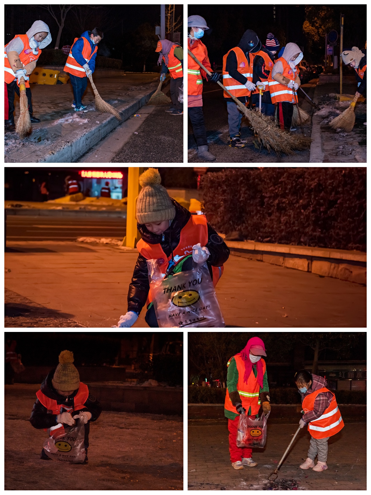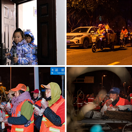 凌晨五點,當薄雪籠罩的南京尚未蘇醒時,“城市美容師”們不俱寒冷,在刺骨的寒風里穿梭勞動,“寧愿一人臟,換來萬家凈”。另一邊燈火昏明的室內(nèi),小志愿者們第一次見到凌晨五點的南京,他們冒著刺骨的寒風,走出家門,來到街道,親眼了解到一直以來他們覺得時刻干凈清爽的街道背后原來是環(huán)衛(wèi)工人們頂著寒風默默辛勤勞作的成果。