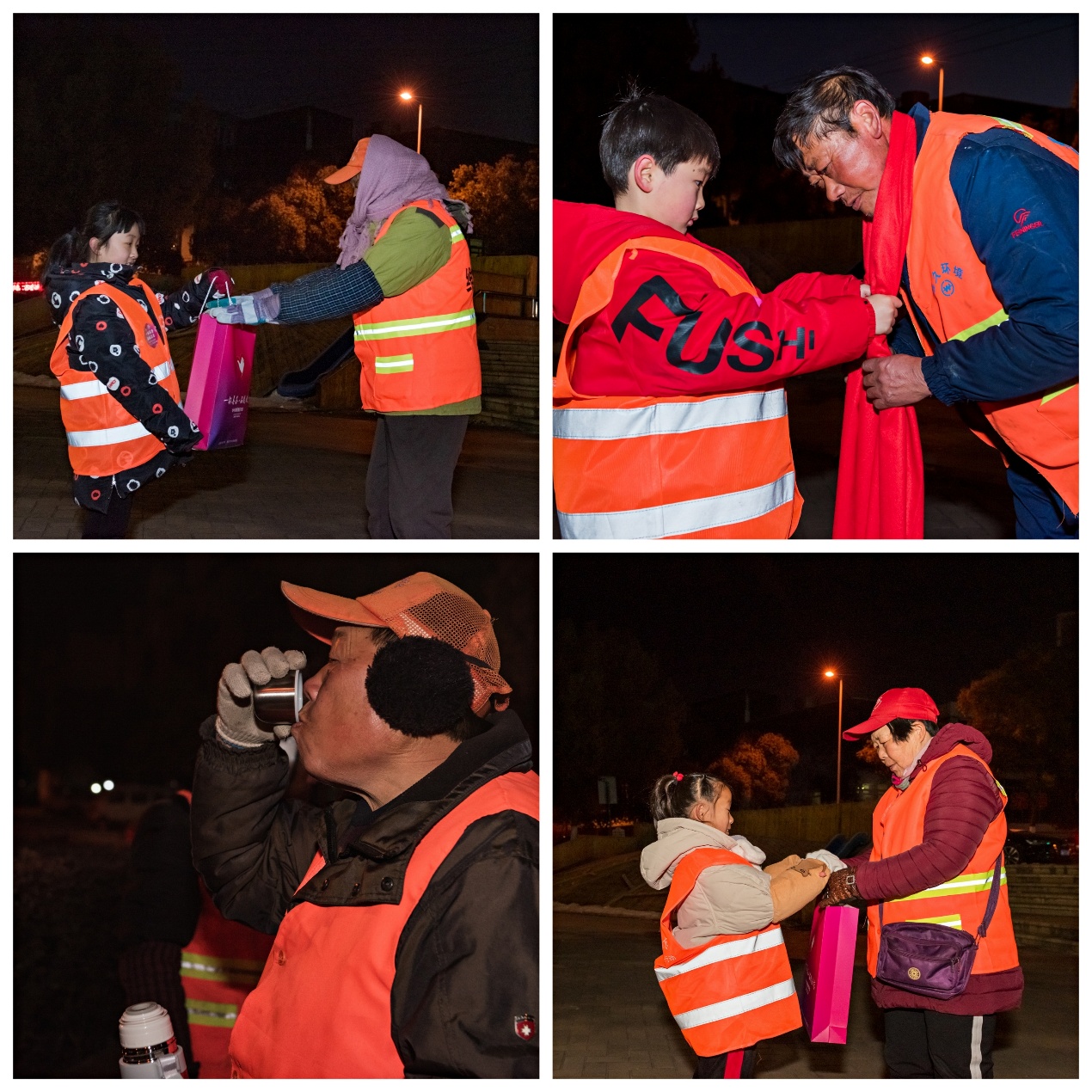 “叔叔阿姨辛苦啦!謝謝你們!因為有你們,我們才有干凈的生活環(huán)境!”小志愿者一個個手捧著點心、圍巾、裝滿親手制作姜茶的保溫杯,送給環(huán)衛(wèi)工作者手中,并以自制小卡片的形式對他們送上冬日里溫馨的祝福。寒風瑟瑟,不少孩子的臉凍得紅紅的,但大家的臉上卻洋溢著興奮的笑容。身為“城市美容師”的環(huán)衛(wèi)工人們也因為小小志愿者送上的那一杯姜茶、一份暖心禮物而感到油然的溫暖。