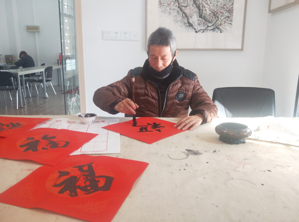 活動中,石埠橋村社區(qū)殘疾人之家小灣書畫院的書法家和書法愛好者們?yōu)樯鐓^(qū)居民免費創(chuàng)作春聯(lián)、寫“福”字等。整個現(xiàn)場紙墨飄香,桌上、地上鋪滿了春聯(lián),氣氛格外熱鬧喜慶。“你們手寫的春聯(lián),比印刷的更好看,年味更濃,更有福氣啊。”居民們一邊等著領(lǐng)春聯(lián),一邊感慨道。一下午,書法家們共為石埠橋社區(qū)居民們書寫了近百幅春聯(lián)。
