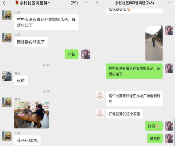 下午兩點,江寧區(qū)東山街道佘村社區(qū)網(wǎng)格員陳然和佘德勝在社區(qū)警網(wǎng)融合工作室辦公,居民孫喜霞哭著向網(wǎng)格員求救“求求你們,快幫我一起找找孩子吧”!原來居民孫喜霞的5歲的兒子在社區(qū)景點玩耍,因家長疏忽大意走失,請求網(wǎng)格員協(xié)助。網(wǎng)格長王亮知曉此事,立即帶領(lǐng)網(wǎng)格員們前往事發(fā)地,在獲悉走失兒童的基本信息、體貌特征后,網(wǎng)格員立即聯(lián)系社區(qū)“智網(wǎng)工程”指揮調(diào)度工作站、佘村社區(qū)警網(wǎng)融合工作站請求協(xié)助,同時將走失兒童的相片和視頻發(fā)送至轄區(qū)各個微信群,呼吁群眾協(xié)助尋找。