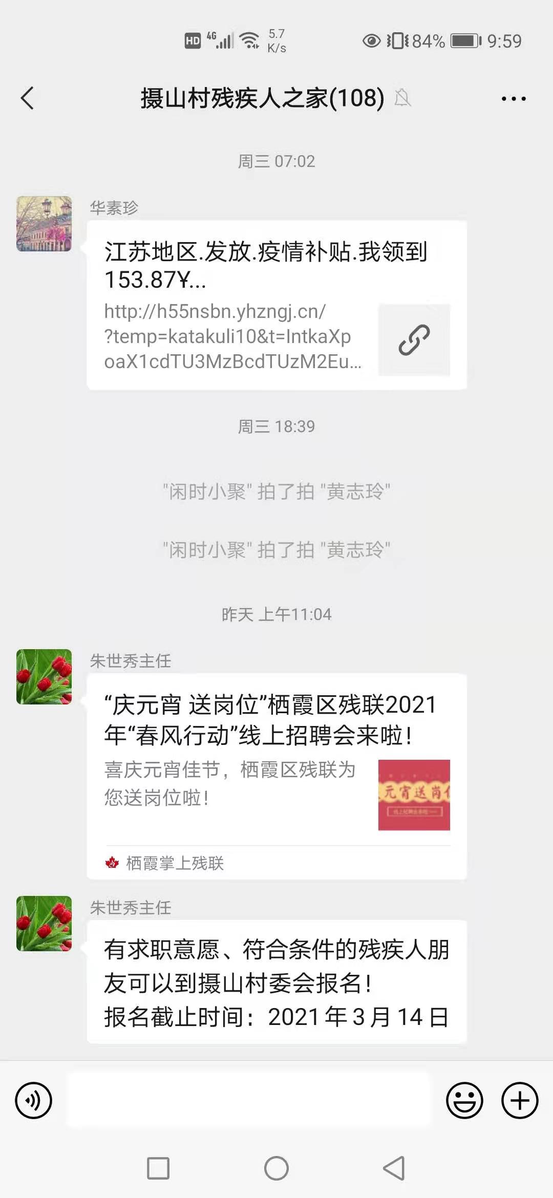 平日里,攝山村殘協(xié)對(duì)轄區(qū)內(nèi)的未就業(yè)殘疾人就業(yè)狀況進(jìn)行日常調(diào)查摸底,確保較全面地掌握村內(nèi)殘疾人員的就業(yè)動(dòng)向,利于日后幫扶工作的開(kāi)展。開(kāi)年以來(lái),不少企業(yè)開(kāi)展招聘,針對(duì)殘疾人提供眾多的就業(yè)崗位。村殘協(xié)充分利用信息化手段,創(chuàng)新就業(yè)服務(wù)形式,在村殘疾人之家微信群中推送線上招聘信息,讓殘疾人求職者足不出戶就可以了解招聘信息、投遞簡(jiǎn)歷。