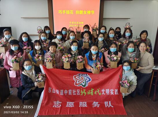 陽(yáng)春三月,桃花盛開(kāi)。為豐富婦女們的精神文化生活,提高對(duì)社區(qū)的歸屬感,3月2日下午,南京市江寧區(qū)東山街道中前社區(qū)工會(huì)聯(lián)合會(huì)、婦聯(lián)邀請(qǐng)社區(qū)女職工、巾幗志愿者在社區(qū)開(kāi)展巧手插花、扮靚女神節(jié)活動(dòng)。