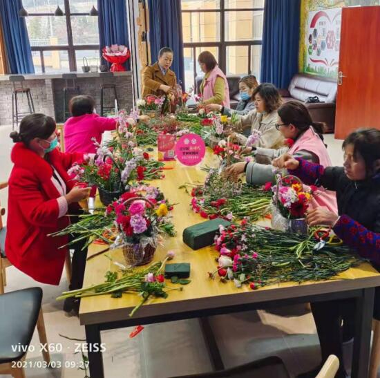 活動一開始,由志愿者深入淺出地講解了此次花卉的品種及不同的插花知識,介紹了插花手法、花卉色彩搭配、每種鮮花的寓意、購買鮮花時的注意事項等基本技巧,然后在志愿者的指導(dǎo)下大家紛紛動手實踐,浪漫粉色的玫瑰、顏色清新的小甘菊、各色花卉放滿了一桌,大家各自發(fā)揮自己的想象,把剛學(xué)到的知識靈活地融入到自己作品中,用自己靈巧的雙手修剪、整枝再根據(jù)不同的色彩、形狀有層次地搭配在一起,一盆盆融合了婦女姐妹們豐富想象力的插花作品展現(xiàn)在了大家的面前,置身于鮮花叢中的婦女姐妹們興致盎然,燦爛的笑容與鮮艷的花朵交相輝映,美麗不凡。