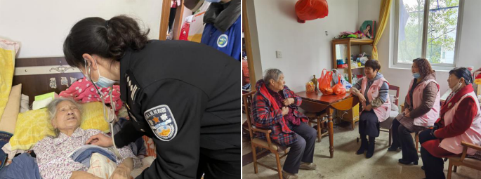 志愿者們?yōu)樯鐓^(qū)一些空巢孤寡老人進(jìn)行上門慰問,送去水果等慰問品,并與其促膝交談,詳細(xì)詢問了老人近期的身體狀況,同時,南京市公安局監(jiān)管支隊執(zhí)法勤務(wù)大隊警醫(yī)送醫(yī)上門,為老人進(jìn)行健康檢查,告知其日常健康維護(hù)注意事項,對其家人詳細(xì)地進(jìn)行了日常護(hù)理指導(dǎo)。