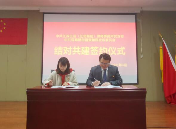 為推動(dòng)社區(qū)治理、深化區(qū)域黨建合作,3月5日上午,南京市棲霞區(qū)邁皋橋街道景和園社區(qū)黨委與江蘇三法律師事務(wù)所黨支部舉辦結(jié)隊(duì)共建簽約儀式。