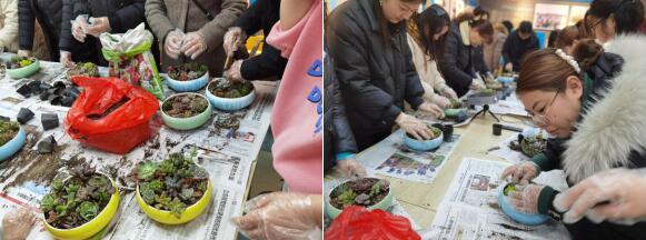 現(xiàn)場,志愿者們帶來了許多不同品種的多肉,有錢串、兔耳朵、三角琉璃蓮等等。大家興趣盎然,在DIY環(huán)節(jié),大家躍躍欲試,紛紛手持小工具饒有趣味地種植起來,一邊歡聲笑語,一邊請教老師意見,一會兒功夫,填土、配色、種植……一盆一盆有模有樣的多肉盆栽完工。“肉友”們抱著自己制作的盆栽開心地對著相機(jī)擺起pose,并表示在這次活動中體驗了盆栽種植的樂趣、更感受到了很多綠色的正能量。