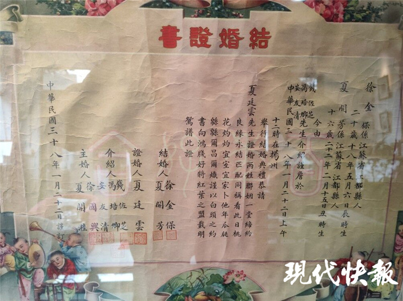 現(xiàn)在,很多新人喜歡租較好的婚車(chē)作為“門(mén)面擔(dān)當(dāng)”,而在幾十年前,新人流行請(qǐng)社會(huì)名流為自己證婚。慕相中介紹,展出的一張訂婚證上證婚人是顧伯逵,他是揚(yáng)州有名的畫(huà)家,除了簽字外,在證書(shū)上留下名字的新郎新娘、介紹人、主持人等,都要蓋上印章。