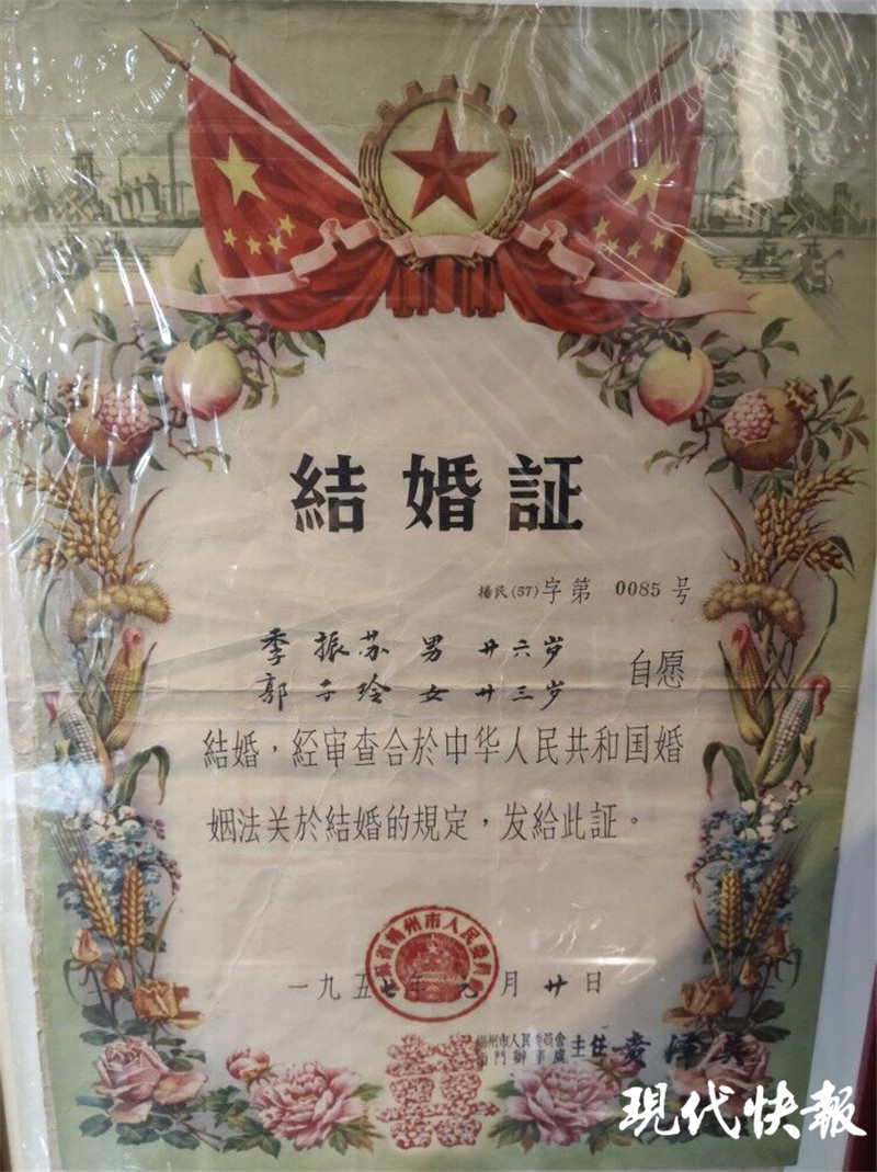 而這樣的照片和實(shí)物,在展覽中還有百余件,分為老照片、訂婚結(jié)婚證書(shū)、結(jié)婚用品等幾大類(lèi),展現(xiàn)了晚清民國(guó)時(shí)期到現(xiàn)當(dāng)代的揚(yáng)州婚嫁習(xí)俗。其中,最早的結(jié)婚照是清咸豐年間所拍。
