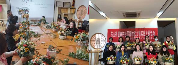 一花一世界,一葉一乾坤?;ǖ朗侵袊鴤鹘y(tǒng)修身養(yǎng)性,陶冶身心的生活藝術(shù)。3月8日上午,在“風(fēng)尚古村,花姿物語”環(huán)節(jié),花藝?yán)蠋熓紫仍敿?xì)講解了鮮花保鮮常識、色彩搭配、插花技巧等,隨后指導(dǎo)大家進(jìn)行插花體驗(yàn)。在淡雅的花香浸染間,大家興致盎然,相互交流技藝、欣賞花籃、拍照留念,盡情享受閑適時光。一小時后,普通的花葉、枝條,經(jīng)過精巧的修飾與創(chuàng)作,變成了錯落有致、賞心悅目的花籃,從而讓婦女同胞們感受到花藝魅力的同時,展現(xiàn)出新時代女性獨(dú)立、陽光、自信的風(fēng)采。