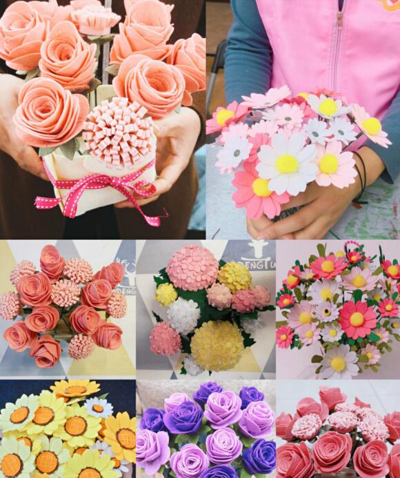 活動現(xiàn)場,社區(qū)志愿者一對一的為大家講解布藝花的制作步驟,居民們對手工制作布藝花的興趣極高,跟著志愿者的節(jié)奏,剪裁、擰捏、粘貼、縫制...把材料包里一片片五顏六色的布做成了一朵朵精美的花。隨后,志愿者又組織居民把各種布藝花:粉玫瑰、康乃馨、向日葵、小雛菊、綠樹葉等搭配組合包裝在一起,居民們一邊研究一邊創(chuàng)作。歡聲笑語中,一件件美麗的花藝作品呈現(xiàn)出來。鄰里之間彼此相互交流制作心得,每個人臉上都洋溢著幸??鞓返男θ荨W詈蟠蠹沂峙踔约旱淖髌泛嫌傲裟?,場面十分溫馨。
