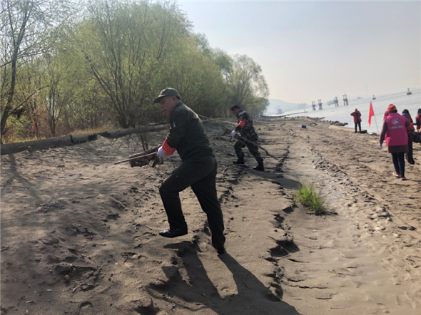 退役軍人志愿者們身穿紅馬甲,佩戴紅袖章,高舉“志愿者服務(wù)隊(duì)”旗幟,大家拿著垃圾袋分頭忙活開來,對岸邊白色垃圾進(jìn)行了撿拾清理。