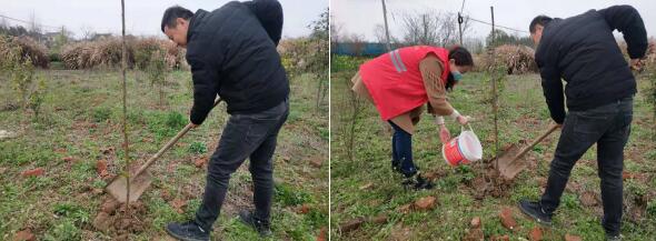 隨后,社區(qū)員工邀請了部分居民志愿者來到我社區(qū)的一塊荒地,一并加入到植樹的活動中來。居民們熱情積極,情緒高漲,用鐵鍬挖出了一個又一個深坑,志愿者們則將準備好的樹苗擺放進去,埋土之后再用鐵鍬壓實,志愿者用清水進行澆灌,灌溉了一片綠色,一份希望……
