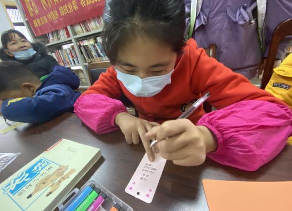 現(xiàn)場,為了激發(fā)青少年參與活動的積極性,還組織青少年們“DIY”書簽。裁剪紙條、勾勒框架,填充顏色......長長的紙條在青少年的創(chuàng)意繪制下組合成漂亮的書簽??粗约旱某善?,青少年們的臉上露出燦爛的笑容。